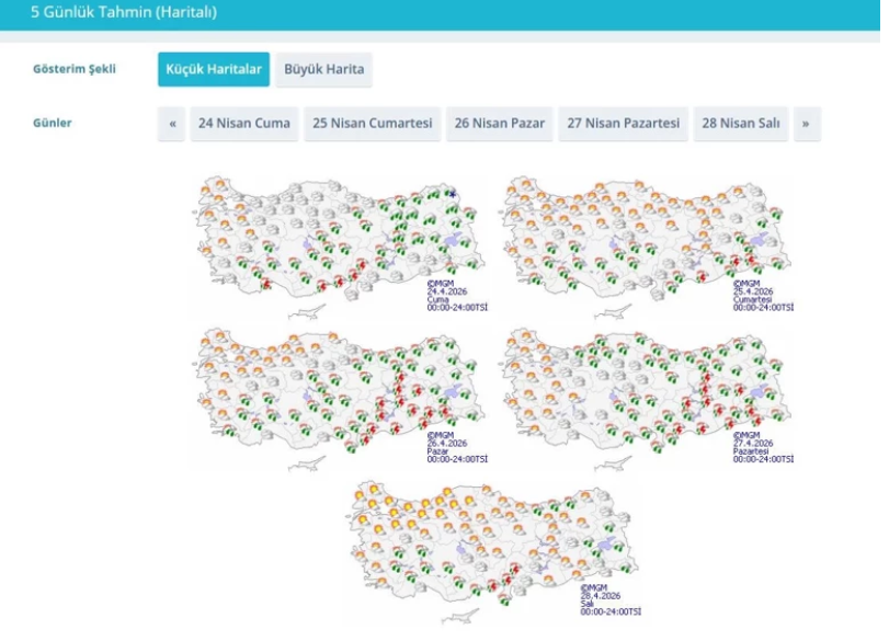 Meteoroloji Genel Müdürlüğü tarafından yapılan son değerlendirmelere göre: Ülkemiz genelinin parçalı ve çok bulutlu, Akdeniz (Hatay hariç), İç Anadolu’nun güney ve doğusu, Doğu Karadeniz, Doğu Anadolu ile Muğla, Denizli, Afyonkarahisar, Ordu, Tokat, Amasya Siirt ve Adıyaman çevrelerinin aralıklı yağmur ve sağanak, yer yer gök gürültülü sağanak yağışlı, Doğu Karadeniz’in iç kesimlerinin yüksekleri ile Doğu Anadolu’nun kuzeydoğusunun yükseklerinin karla karışık yağmur ve yer yer kar yağışlı geçeceği tahmin ediliyor. Yağışların; Doğu Karadeniz, Doğu Anadolu’nun kuzeyi ile Isparta, Antalya, Sivas, Bingöl ve Muş çevrelerinde yer yer kuvvetli olması bekleniyor. Doğu Karadeniz’in iç kesimleri ile Doğu Anadolu’da yüksek kar örtüsüne sahip eğimli alanlarda çığ ve kar erimesi tehlikesi bulunmaktadır.